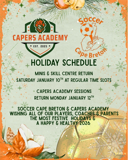 Soccer Cape Breton and the CAPERS Academy would like to wish all of our players, coaches and parents the most festive of holidays and a happy and healthy New Year in 2026.